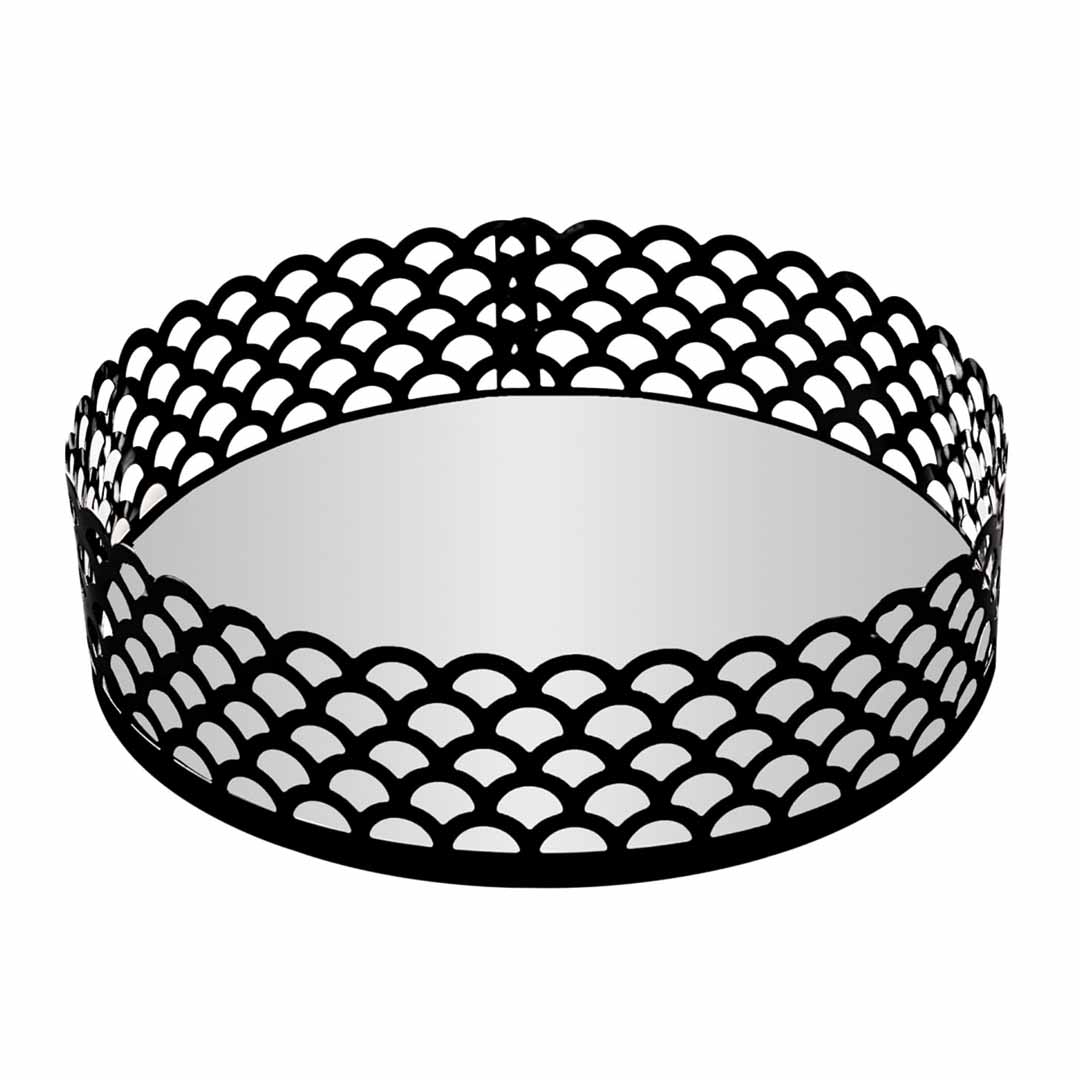 Feita em metal na cor preta, a bandeja tem formato redondo com fundo em espelho que reflete a luz e realça a decoração. Suas bordas trabalhadas dão um toque elegante ao design. Produto indicado para uso decorativo ou prático, organizando objetos sobre mesas, aparadores ou bancadas.
