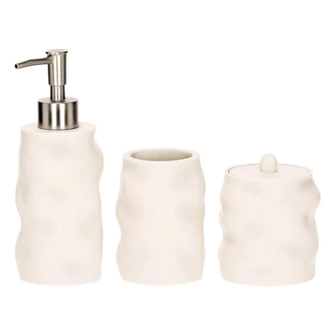 Jogo de Banheiro 3 Peças Off White em Poliresina – Dispenser, Copo e Pote.Organize sua bancada com estilo e durabilidade. O conjunto inclui porta sabonete líquido com válvula metálica, copo para escovas e pote com tampa — três peças essenciais para um banheiro sempre arrumado. Produzidas em poliresina, oferecem resistência, estabilidade e limpeza prática. A cor off white é neutra e sofisticada, combinando com diferentes revestimentos e metais.